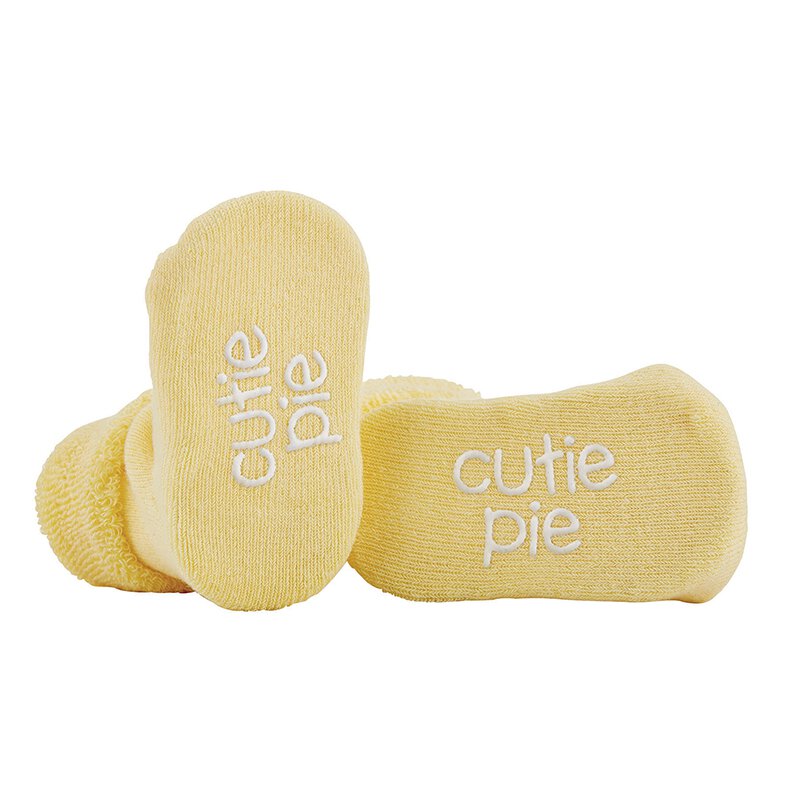 Silly Socks are cotton on the outside and terry on the inside!  The non-slip printing on the bottom of socks features the cute saying 'Cutie Pie'.