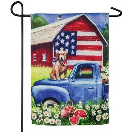 This garden size suede flag features a farmhouse scene with a vintage blue truck surrounded in daisies, a barn painted with the American flag, a picnic basket with watermelon and a dog on top of the hood of the truck wearing a bandana.