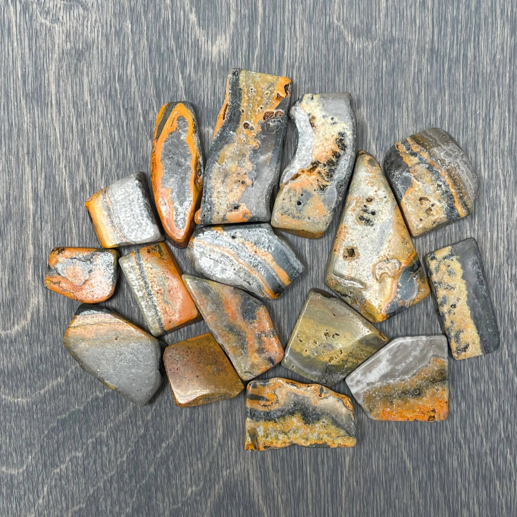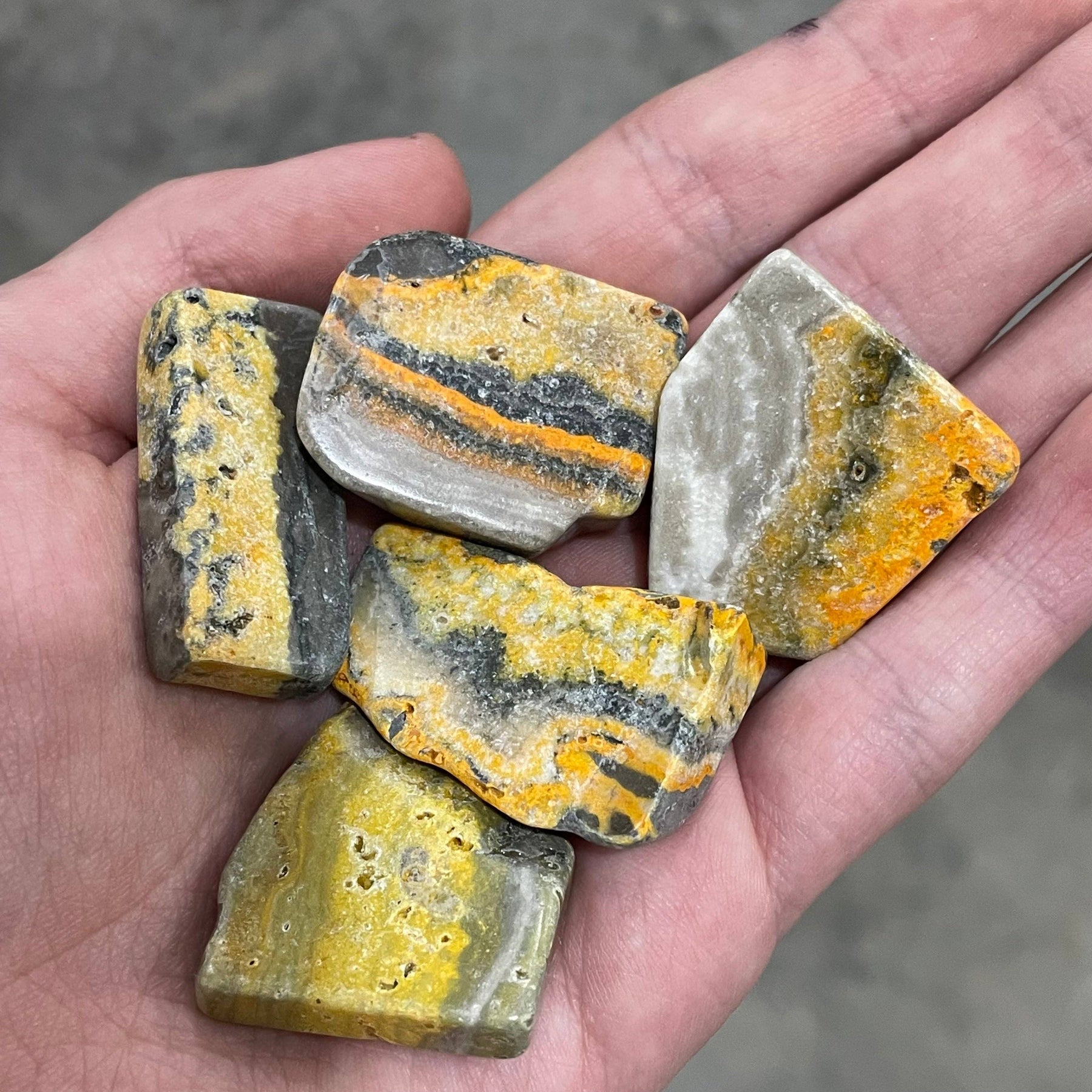 Bring vibrant energy and bold patterns to your collection with these Bumblebee Jasper slabs. Known for their striking yellow, orange, and black banding,