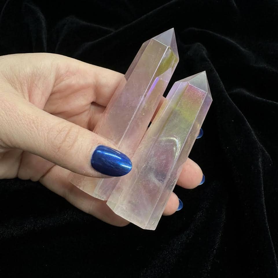 Soft, radiant, and beautifully iridescent, these Angel Aura Rose Quartz Towers bring a magical shimmer to any crystal display. Each tower begins as natural rose quartz and is treated with a premium aura finish, giving it its signature pearlescent glow.