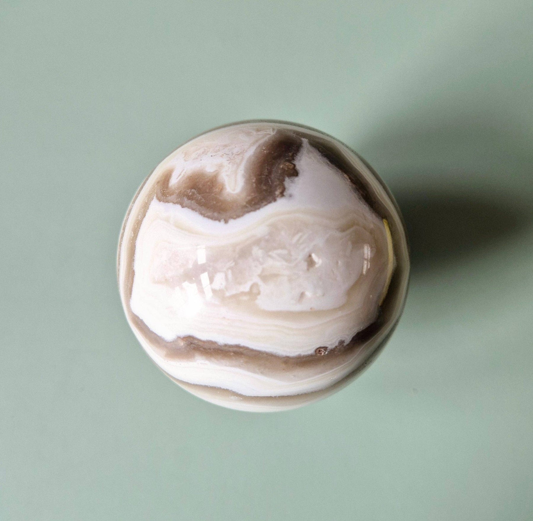 This unique Coffee Agate sphere (60 mm) exudes grounding, calmness, and stability. The warm brown and cream tones are reminiscent of a delightful cup of coffee and bring a soothing, balanced energy.