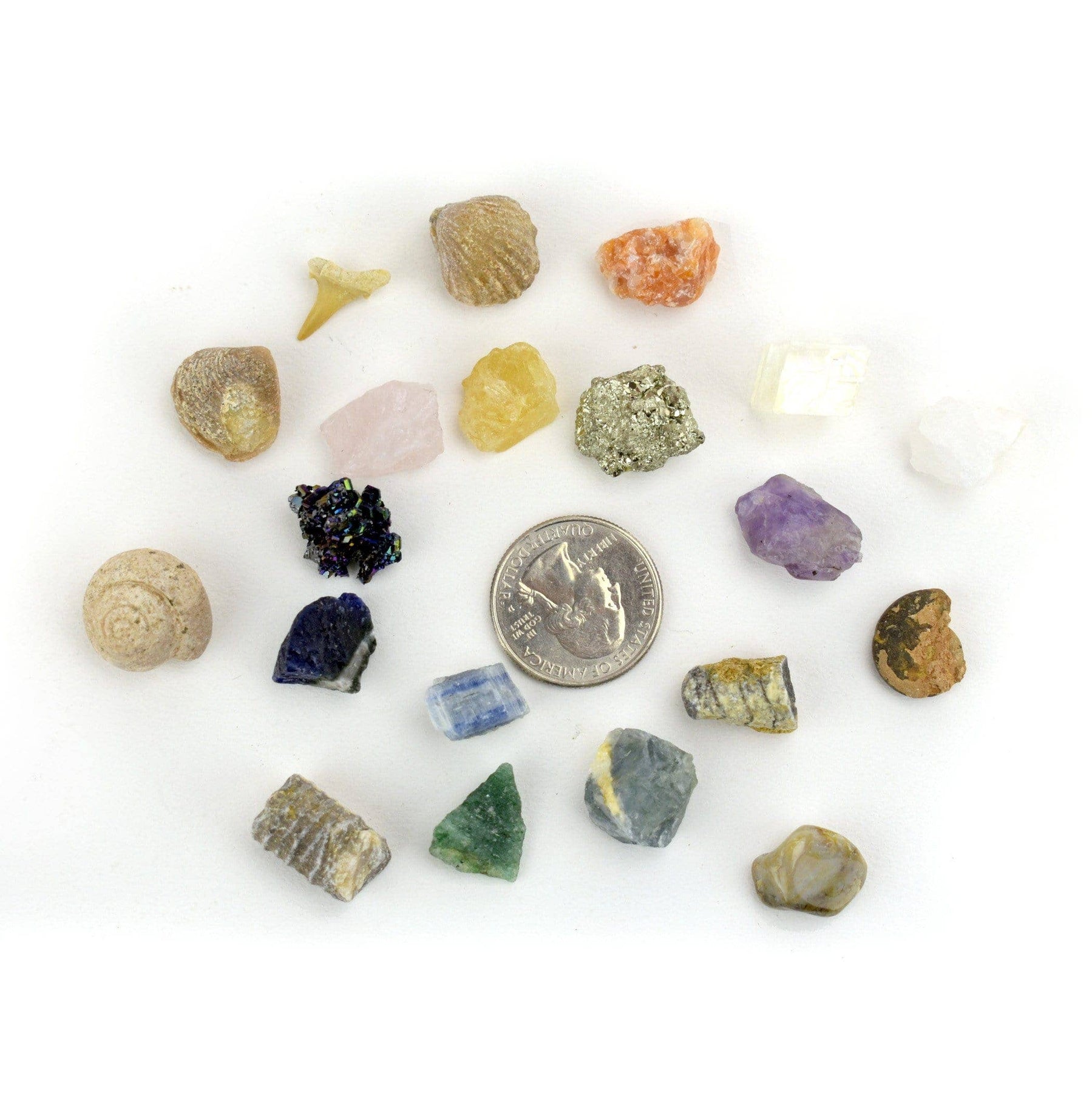 This is a set of assorted fossils and stones which may include: Fossils of Ammonite, Clam, Coral, Wood, Shark Tooth, Nautiloid, and Brachiopod, Stones of Fluorite, Sodalite, Agate, Rose Quartz, Crystal Quartz, Pyrite, Moonstone, Tourmaline, Geodes, Orange Calcite, Orchid Calcite, Peacock Ore, Amethyst, Green Aventurine Each set brings lots of fun in identifying and examining.