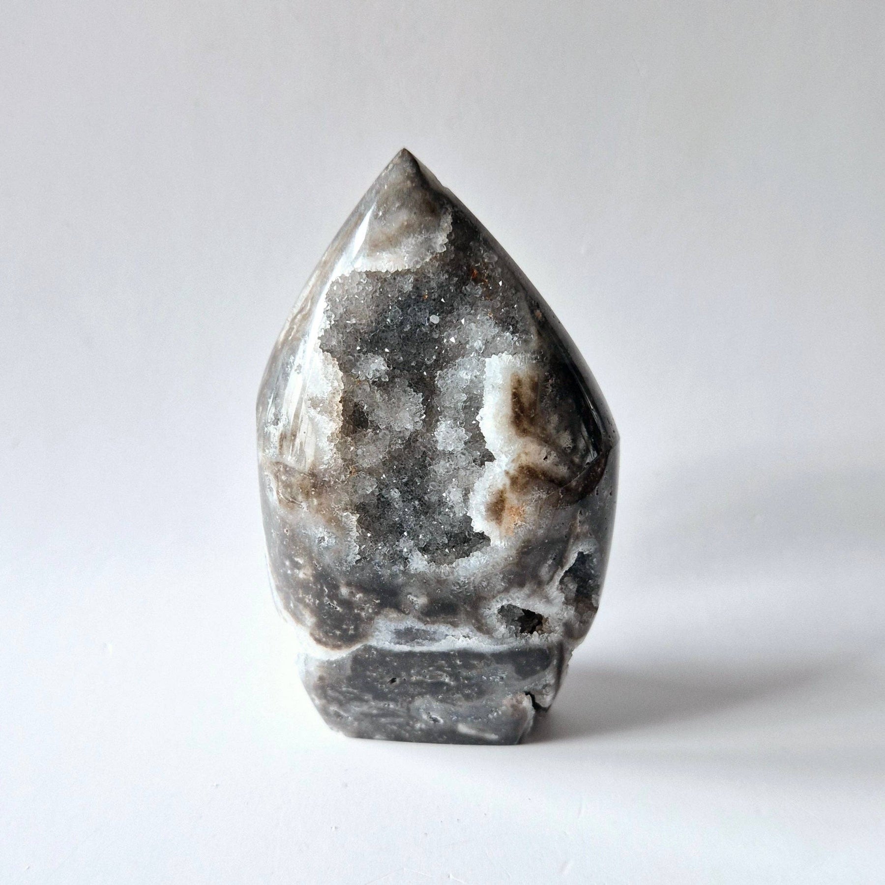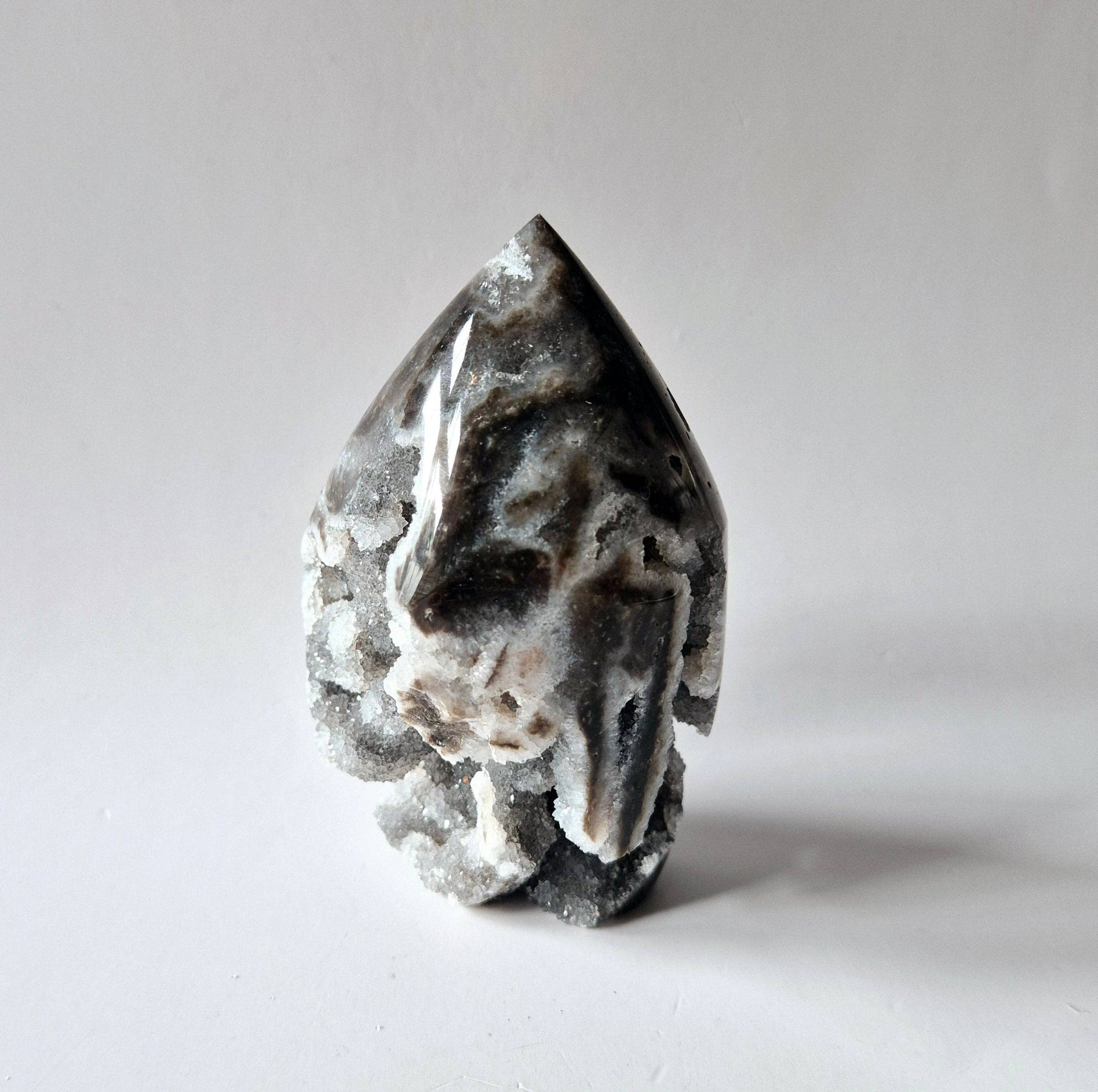 Be enchanted by the deep, mysterious shine of this hand-carved Sphalerite flame. With its natural brilliance, crystalline druzy inclusions, and organic shapes, this sculpture is not only an energetic power object but also a true work of art for your altar, interior, or gemstone collection.