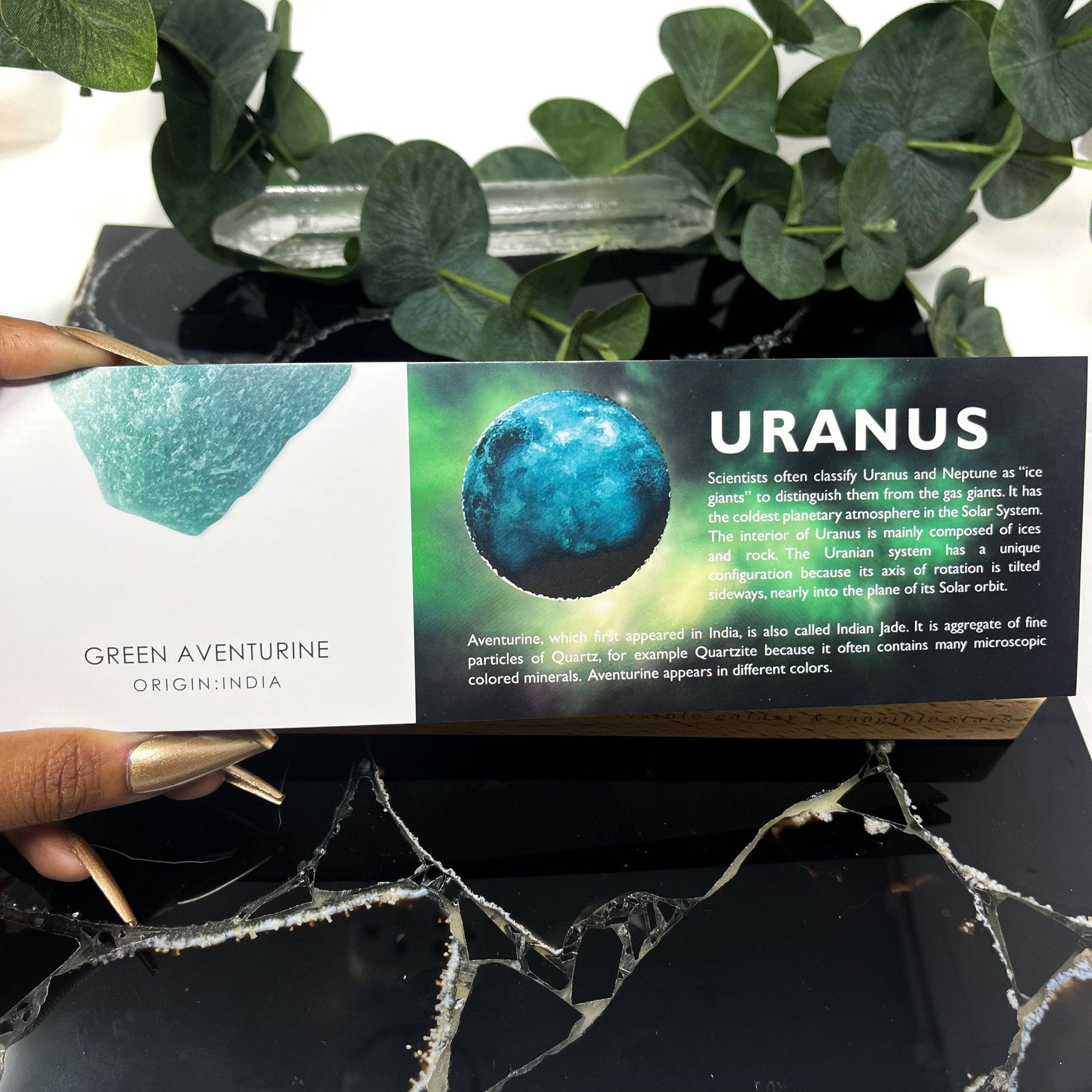This listing is for one "Solar System" boxed gift set that includes a wooden stand, along with 8 mini spheres (sorry Pluto!) that represent a planet in our solar system. Set also includes informational cards with facts about the stones and the planets they represent.
