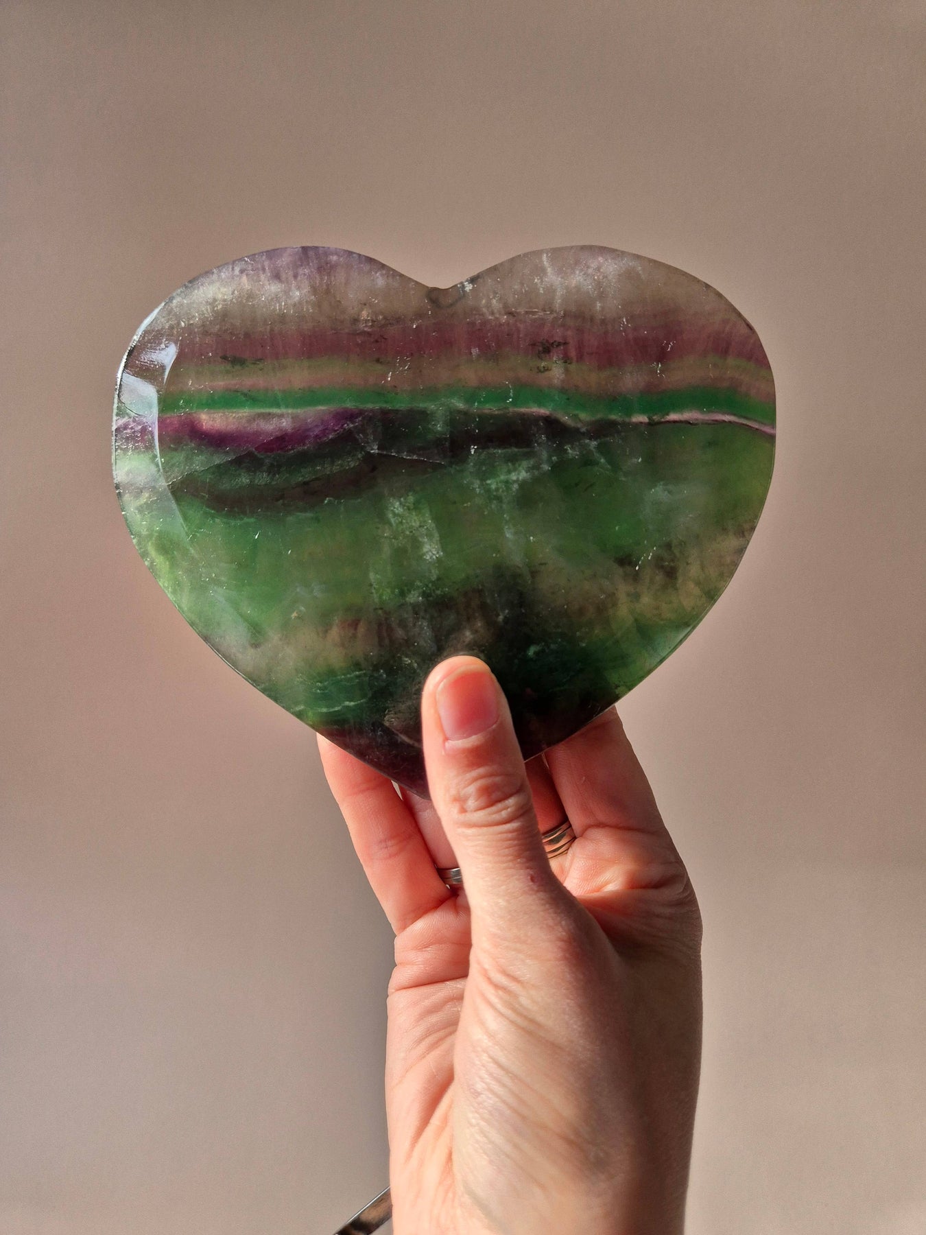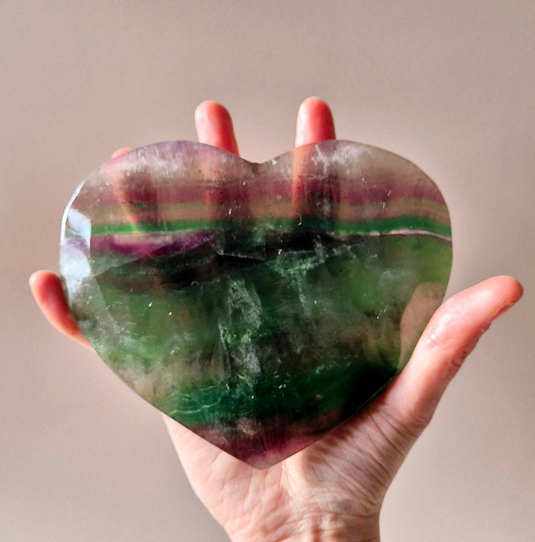 These large Rainbow Fluorite hearts are not only beautiful to look at but also powerful to use. With their soft shapes and deep layered colors, they are perfect as a symbol of balance, love, and intuitive strength. Each heart is unique in color and pattern ā from translucent green to purple and everything in between.