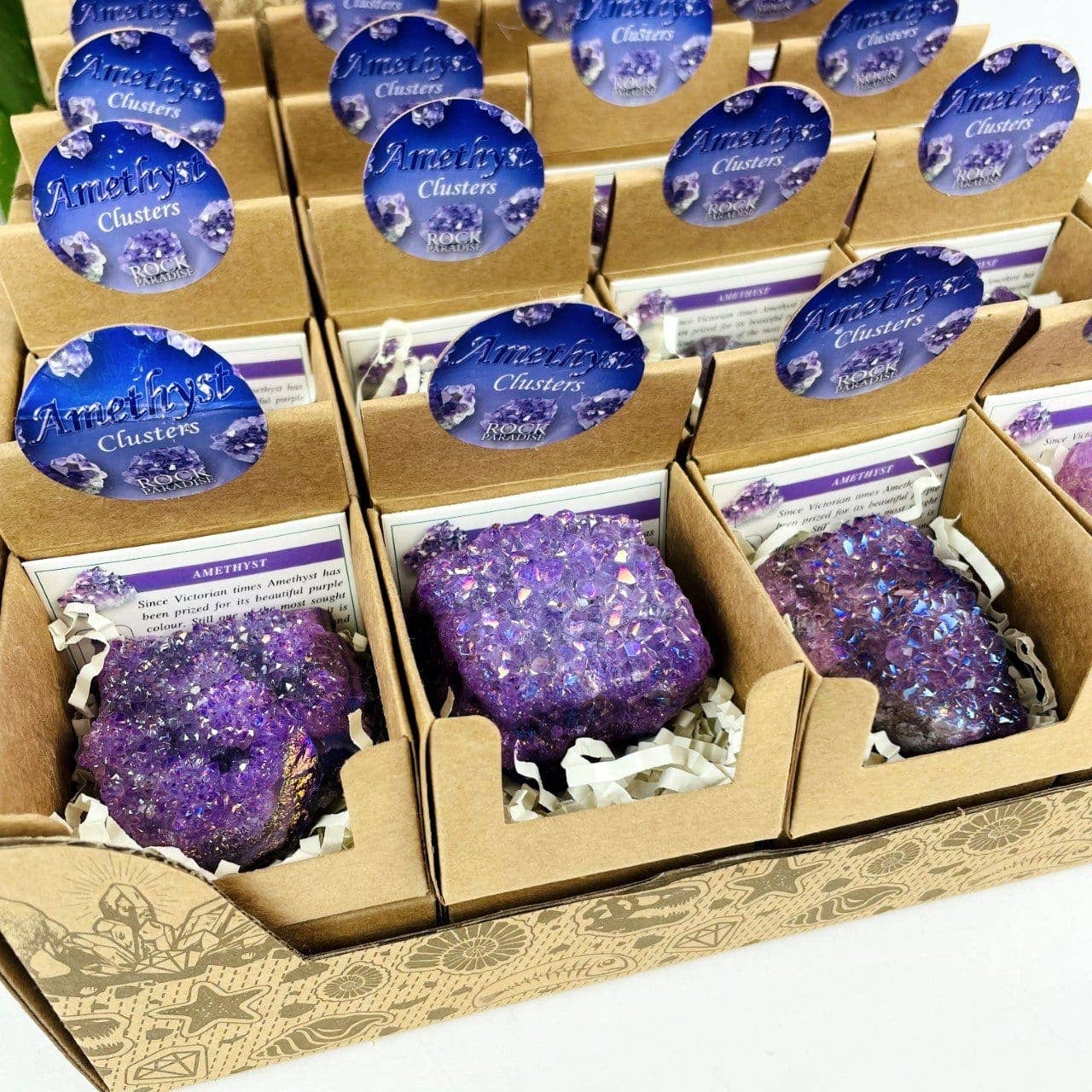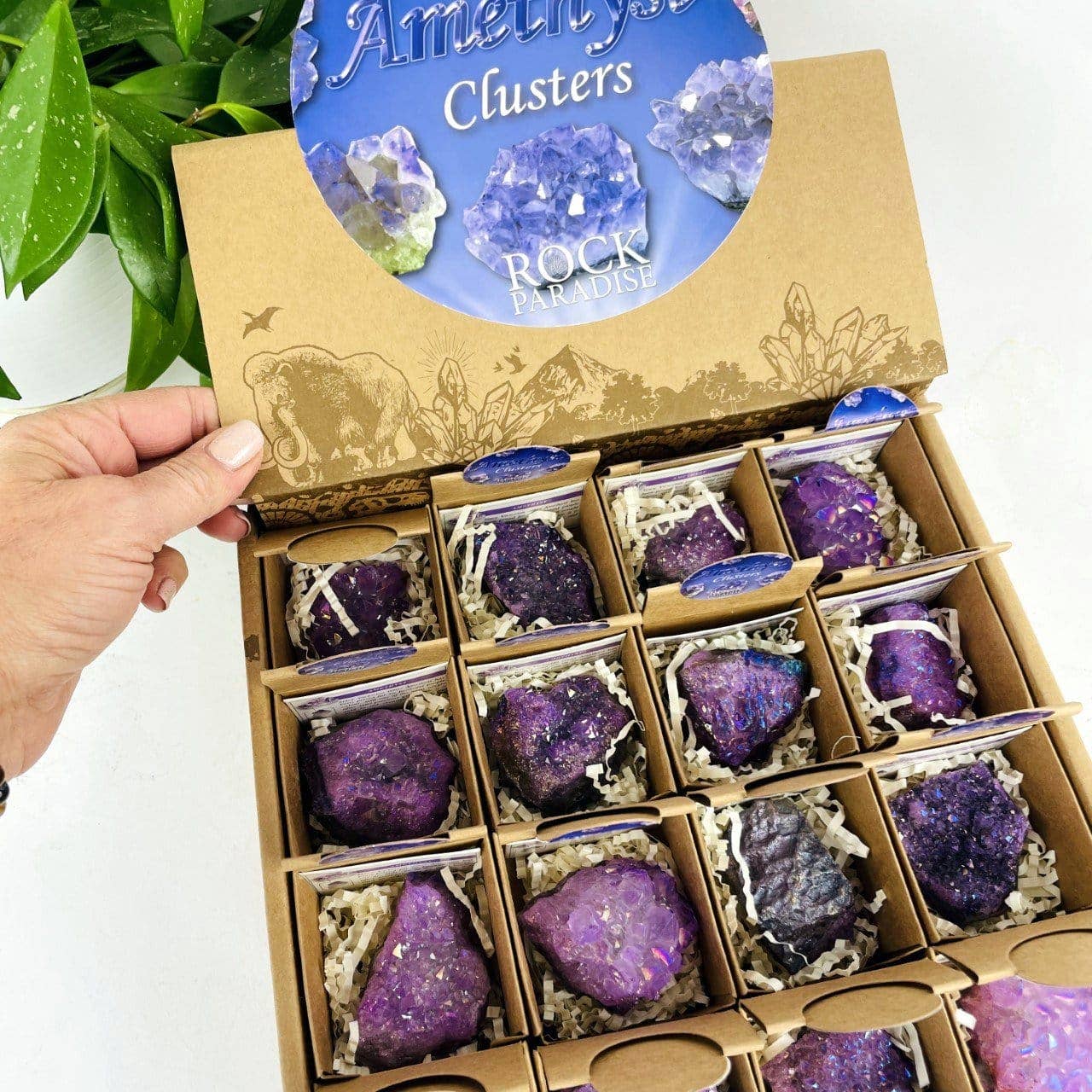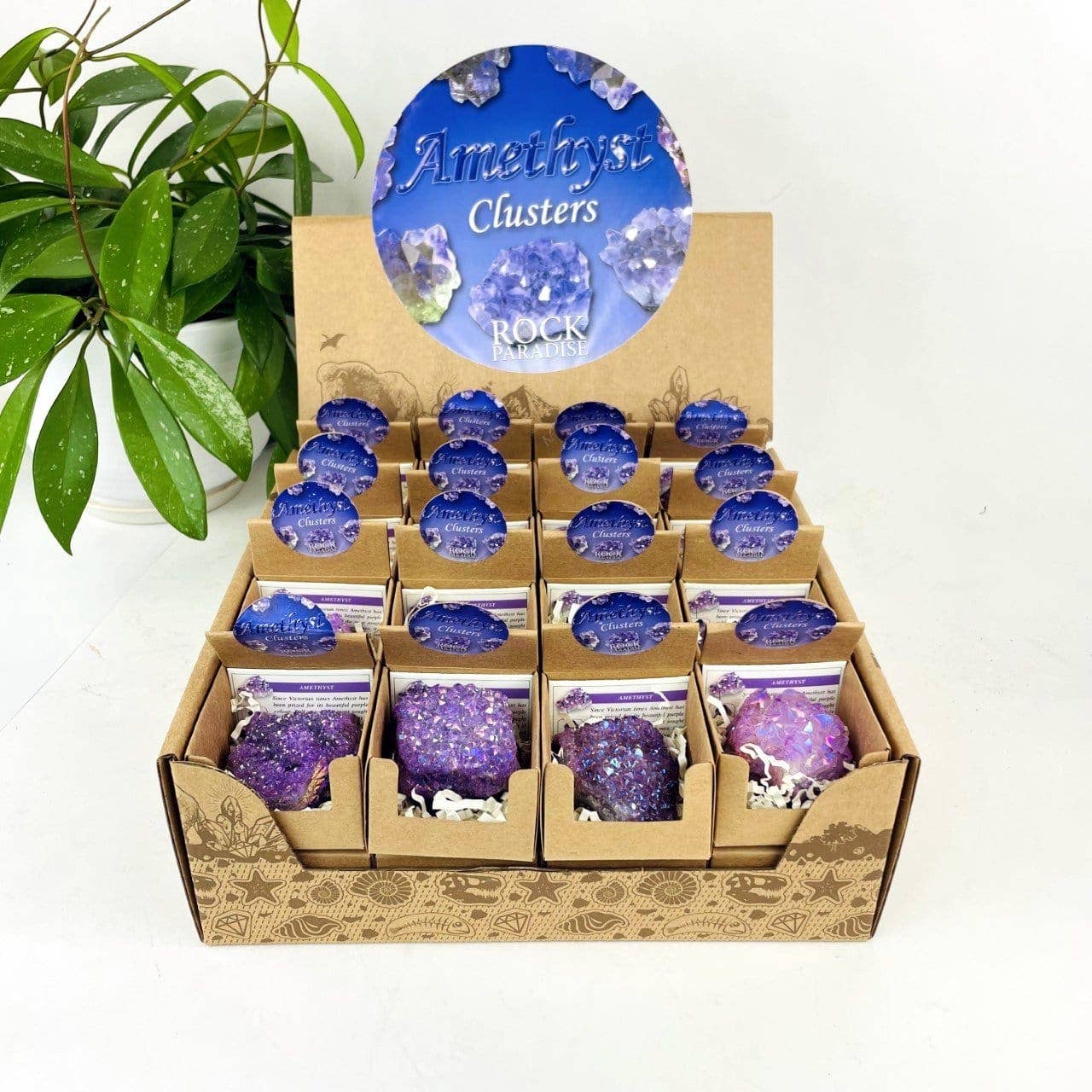 This listing is for ONE BOX of 32 pieces of Amethyst Aura Crystal - Box of Geodes - Point of Purchase Display (RK30-27)