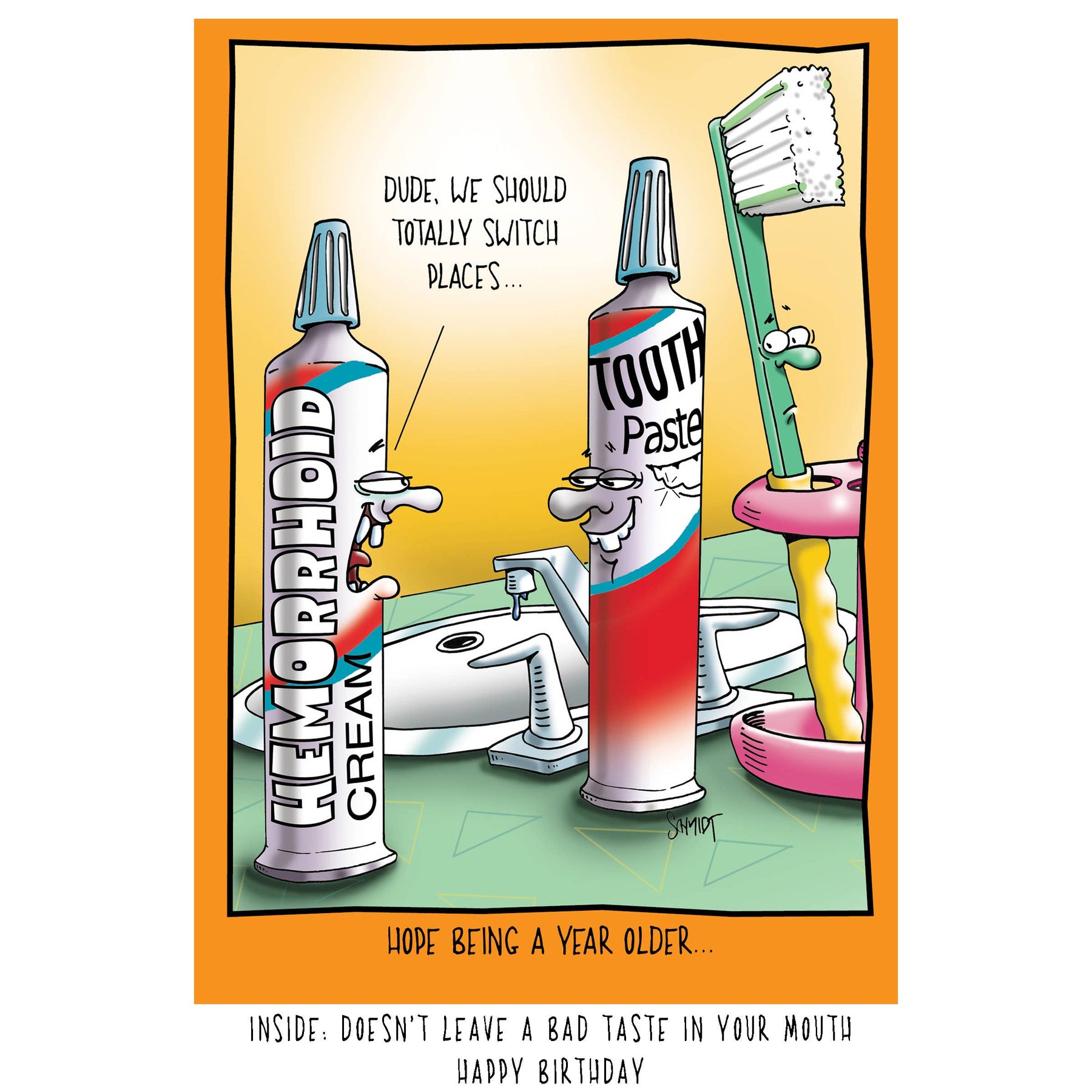 Swapping hemorrhoid cream and tooth paste is a formidable prank! This card is great for getting your customers laughing.