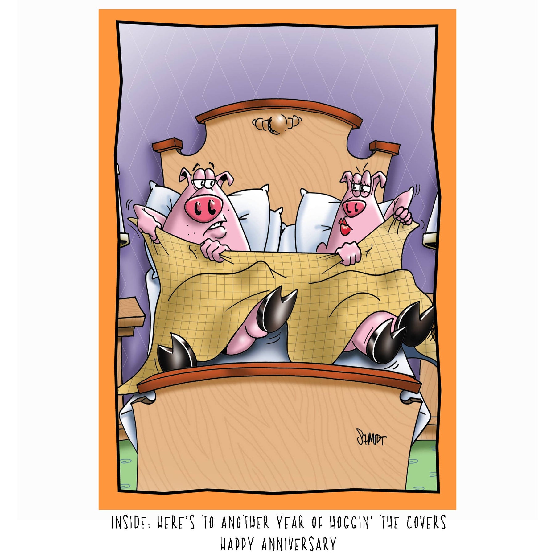 Complete Inside Message: Here's to another year of hoggin' the covers Happy Anniversary - Case of 6 contains 6 greeting cards with matching envelopes - Retail price of $3.49 is printed on the back of each card - All cards are standard 5"x7" size and printed in the USA - Orders ship in 1-3 business days