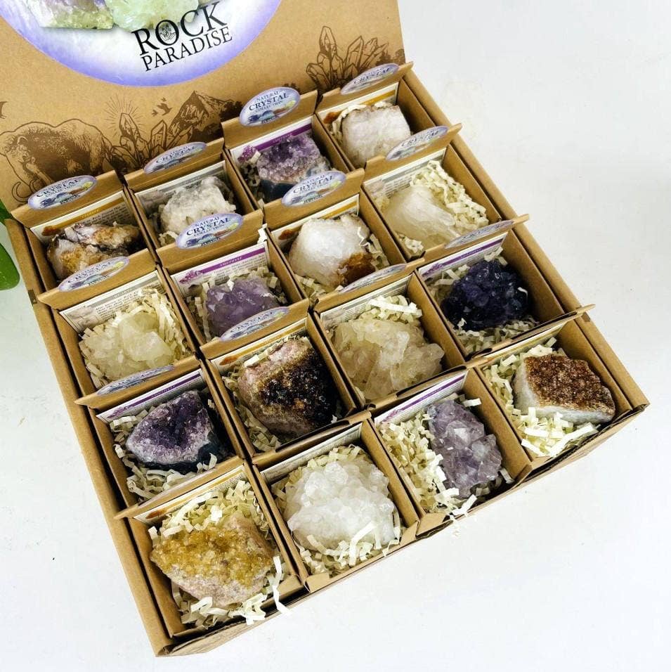 This listing is for ONE BOX of 32 pieces of Natural Crystal - Box of Crystals - Point of Purchase Display (RK28-40-03BOX) Crystal Quartz, Amethyst and Citrine Clusters.